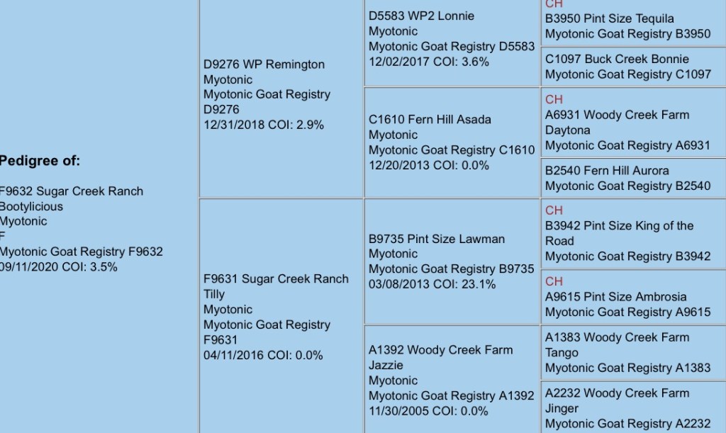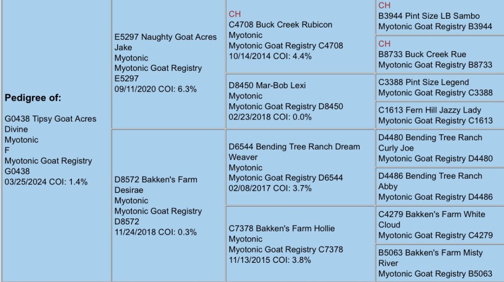 Booty is a sweet girl. She waddles when she walks. She stiffens pretty frequently. She is an excellent mom and raised one HUGE doeling this last spring. She is exposed to Ariat for spring 2026 kids. $300Divine is a fatty patty. She stays fat on air. Sheβs always pretty rotund. She laughs at parasites. Sheβs the only goat I had this year that didnβt need dewormed, even during a pretty wicked barber pole attack. She was too young to breed for 2025 kids. She is exposed to Ariat for 2026 kids. $300This polled, blue eyed beauty is a farm favorite. Sheβs a thick girl with a nice build. She KNOWS how pretty she is. She really struts her stuff when she walks. She is not one tocause any trouble. She was too young for 2025 kids but she is exposed to Ariat for 2026 kids. $300